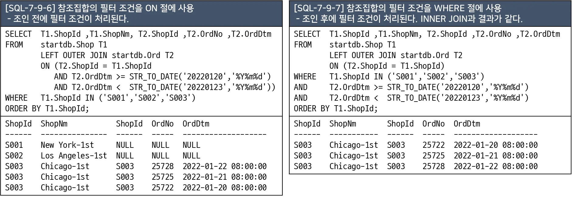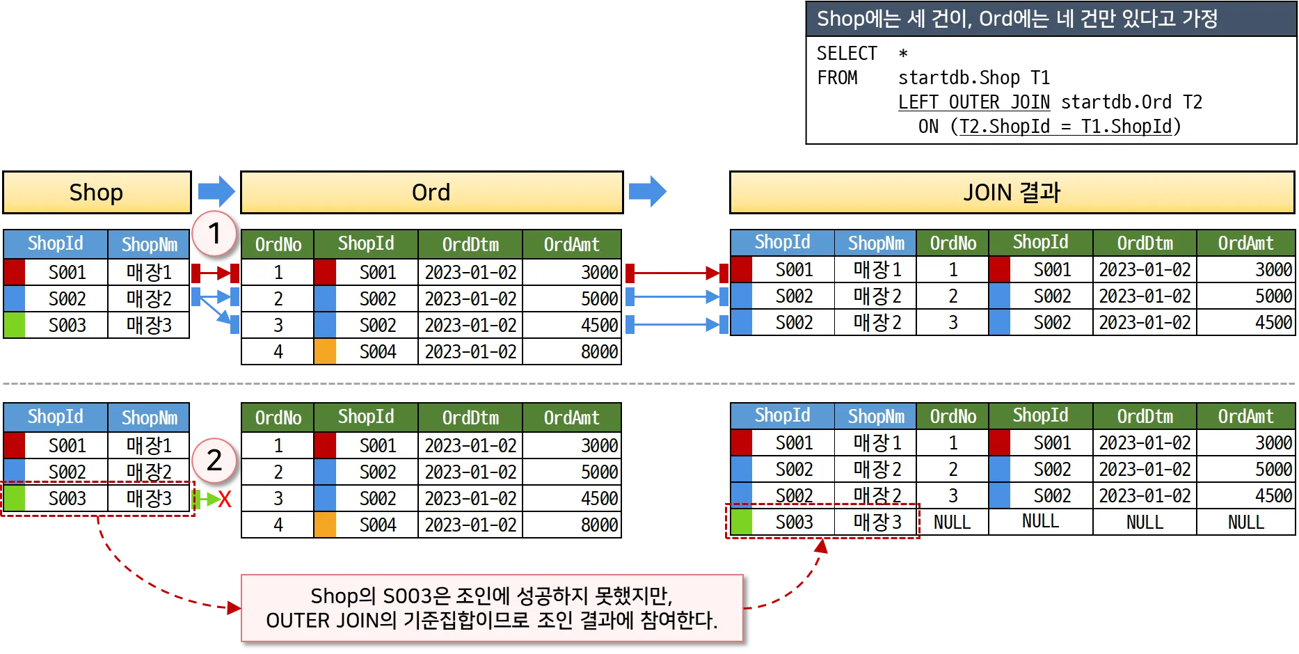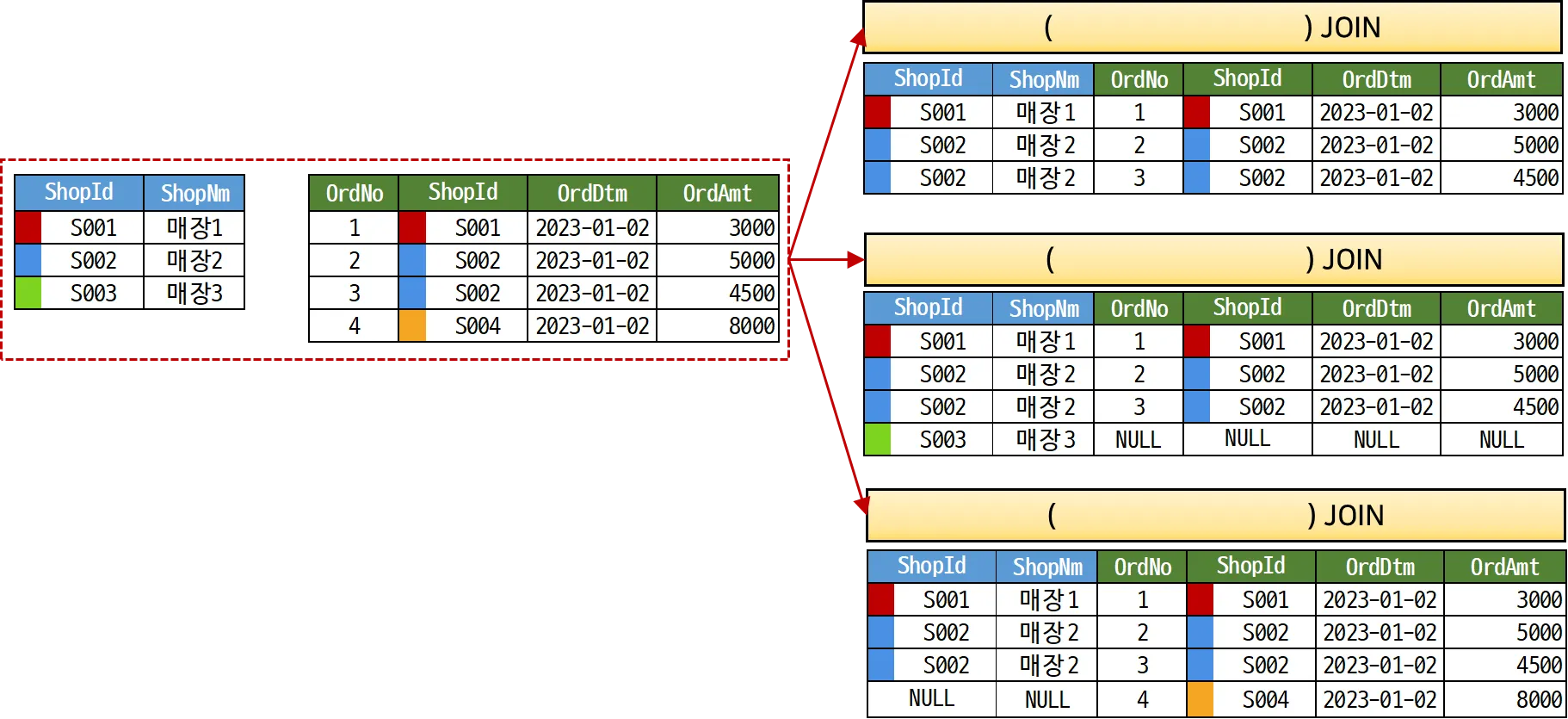 S001, S002 매장은 조인 조건에 만족하므로 데이터가 결합되어 결과에 출력된다.