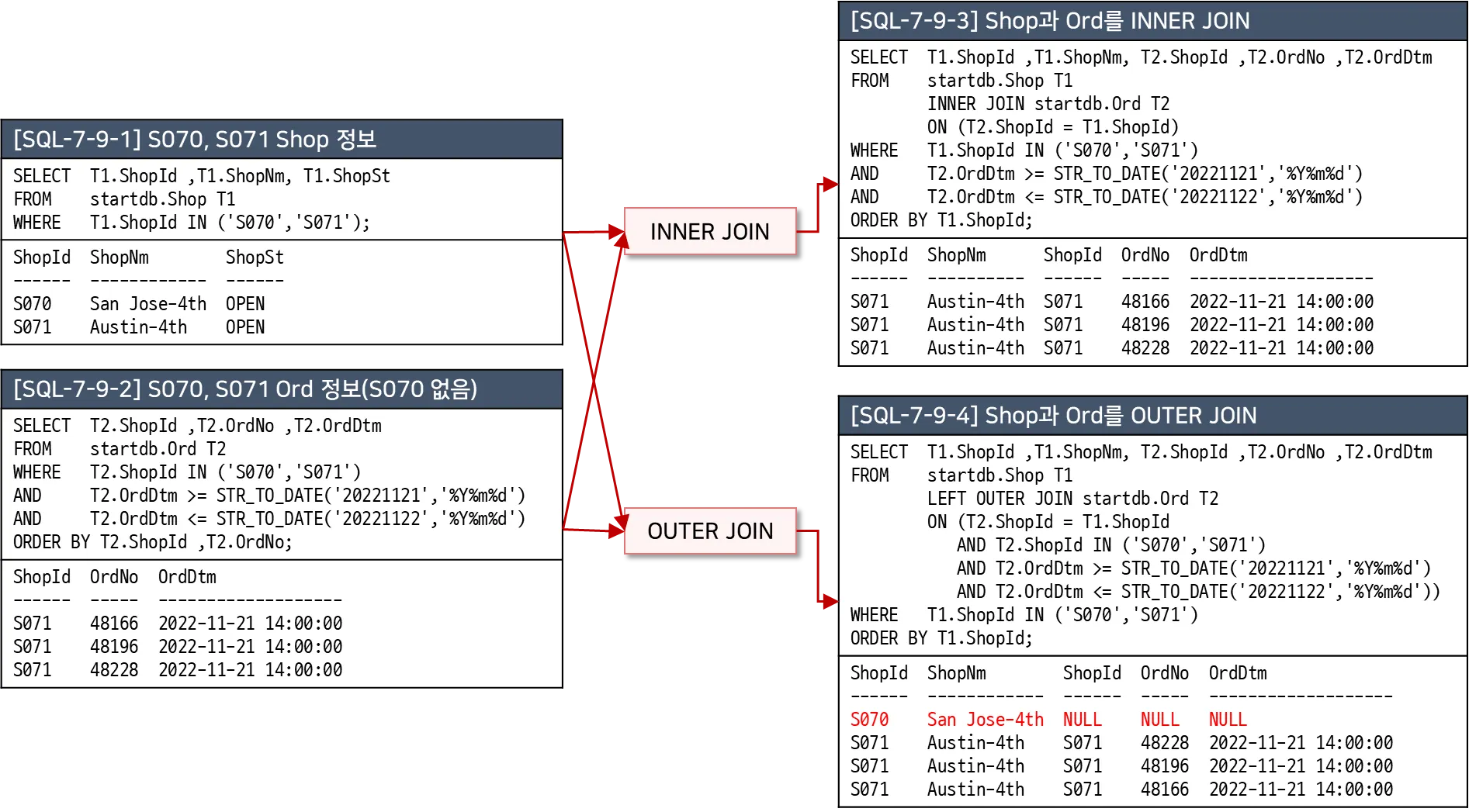 이너 조인에서 사라졌던 S070 매장의 데이터가 아우터 조인 결과에는 포함되어 있는 것을 알 수 있다. S070 매장에 대한 Shop 테이블의 정보(ShopId, ShopNm)는 결과에 포함되어 있고, Ord 테이블의 정보(ShopId, OrdNo, OrdDtm)는 NULL로 채워져 있다.