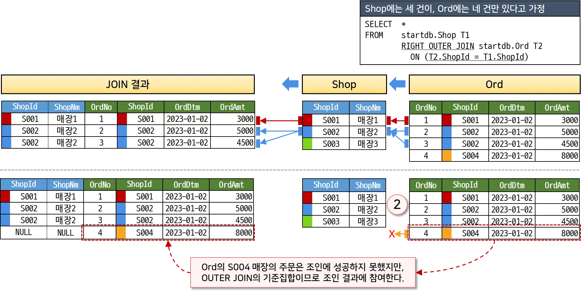 Shop에는 세 건의 데이터, Ord에는 네 건의 데이터만 있다고 가정