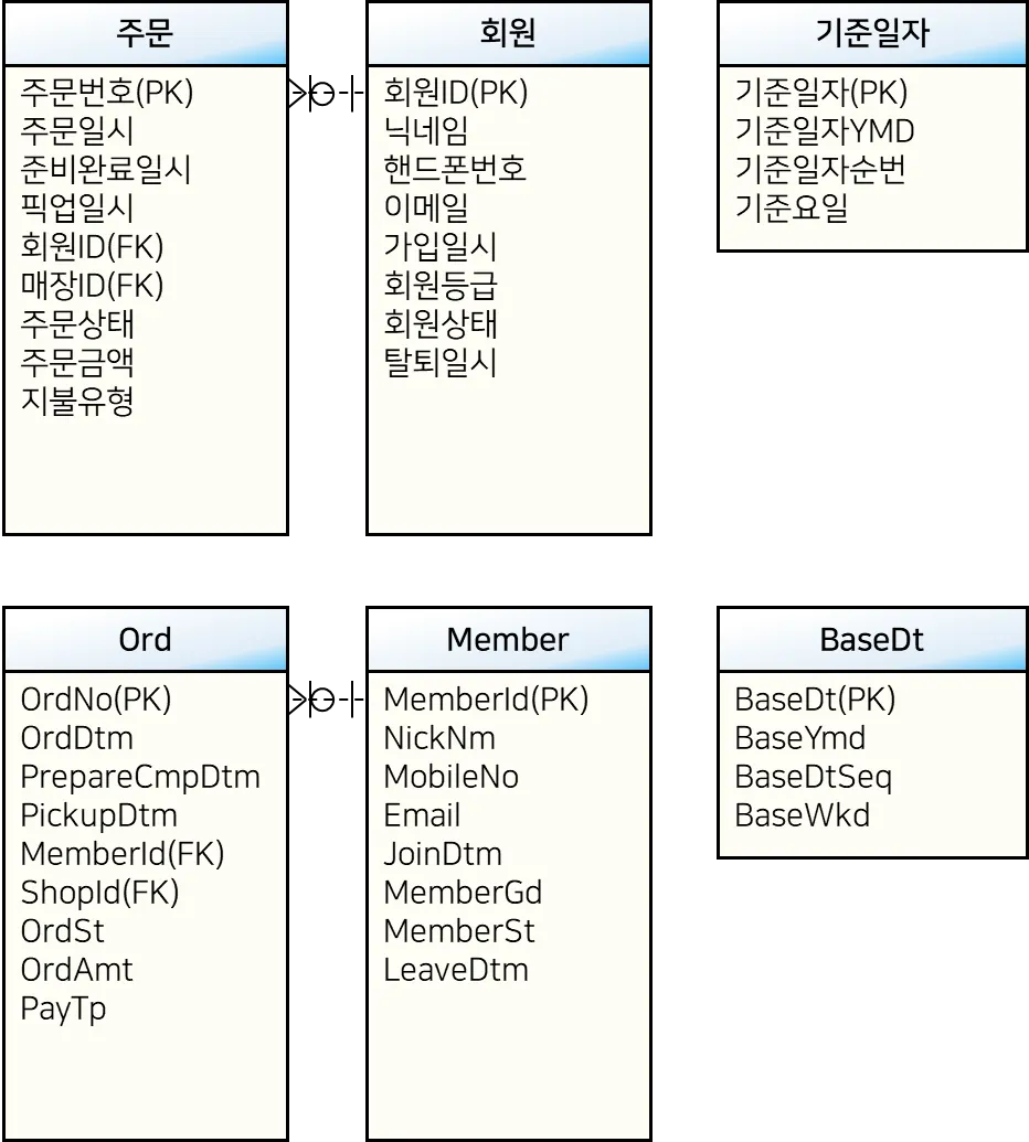 대상 테이블: 회원(Member), 주문(Ord), 날짜(BaseDt)