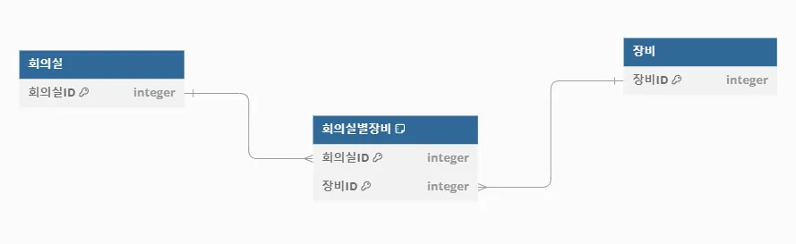 회의실 예약은 고려하지 않습니다. 회의실과 회의실 내 장비 마스터 정보만 설계하면 됩니다.
