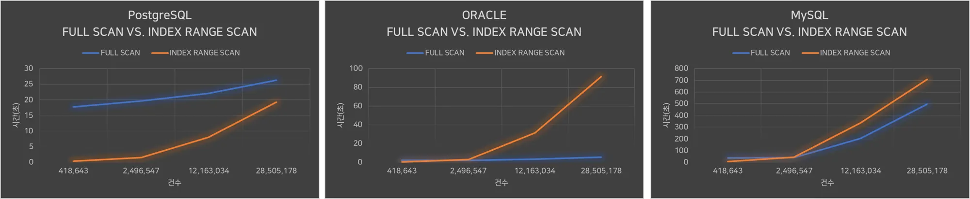 아래는, PostgreSQL과 ORACLE, MySQL에서 조회할 데이터 양에 따른 INDEX RANGE SCAN과 FULL SCAN의 성능을 비교한 차트다.