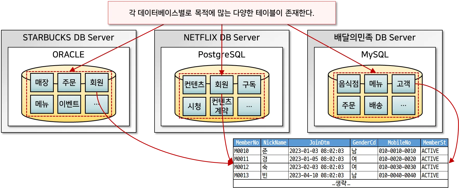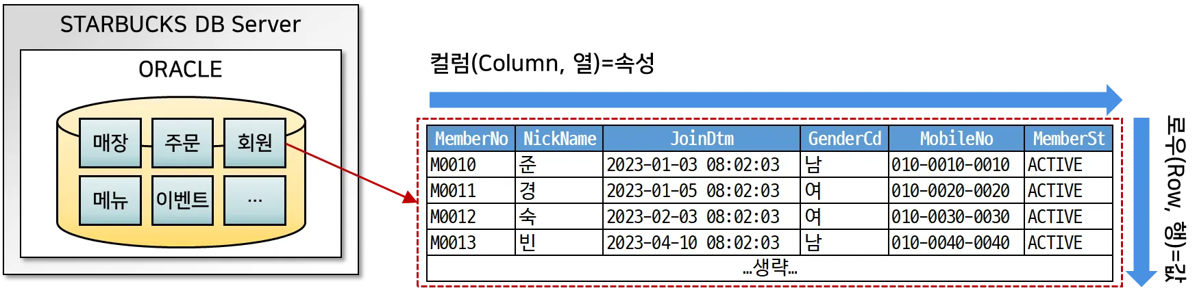 일반적으로 테이블에는 한 종류의 데이터만 담는다. 회원 테이블을 만들어 회원 데이터를 담고, 주문 테이블을 만들어 주문 데이터를 담는다. 마치 김치 그릇에는 김치만 담고 밥 그릇에는 밥만 담듯이 말이다. 한 종류의 데이터란 어떤 한 ‘대상’을 나타내는 속성의 집합이다. 예를 들어 ‘회원’이란 대상(데이터)을 저장하기 위해 회원의 특징인 ‘회원번호, 이름, 생년월일, 전화번호’와 같은 속성을 모아 테이블을 구성한다.
