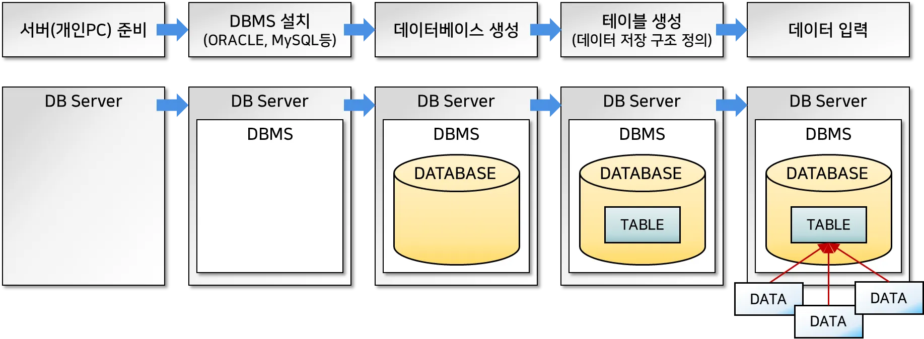 데이터 입력이 이루어기지 위해서는, 서버를 준비하고 DBMS를 설치하고, 데이터베이스를 만들고, 테이블을 만들어야 한다. 이러한 작업이 순서대로 이루어진 후에 데이터가 테이블에 입력될 수 있다.