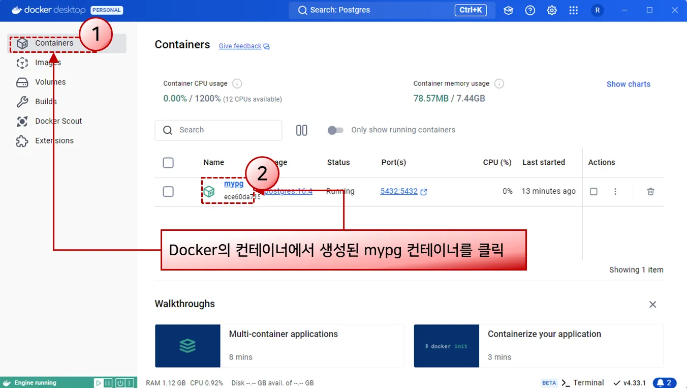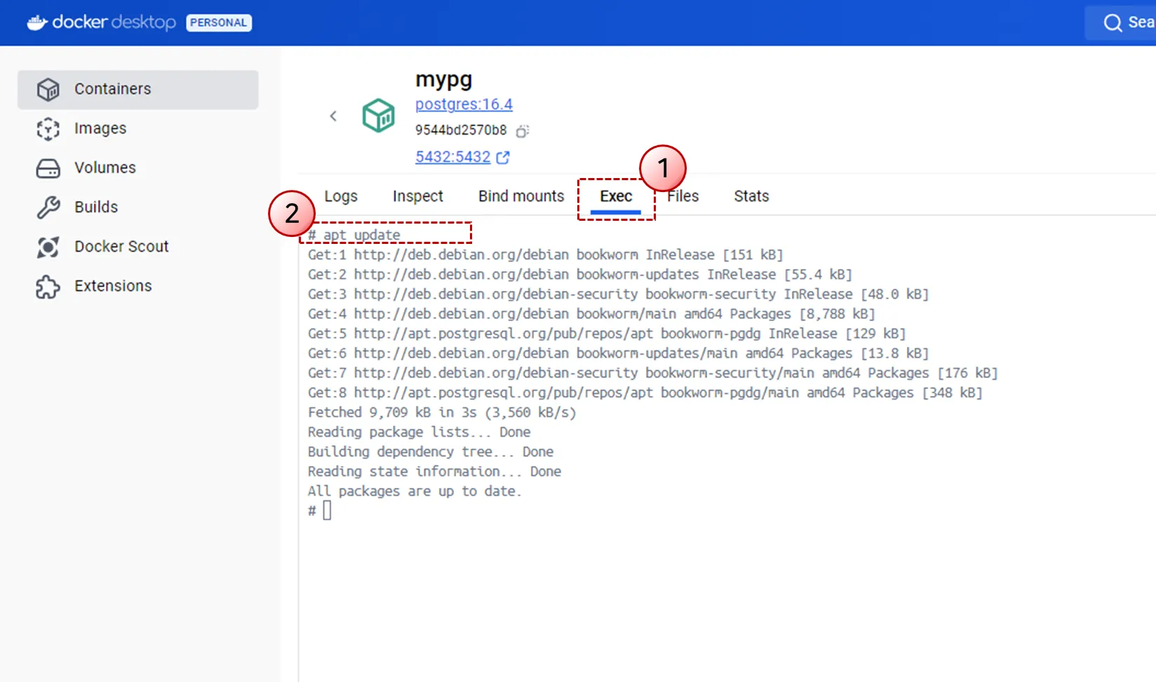 Docker Desktop에서 컨테이너에 진입해 Exec 메뉴를 클릭합니다.