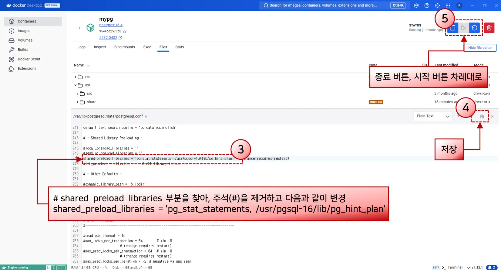 설치된 pg_hint_plan 모듈을 PG가 가동될 때 불러올 수 있도록 설정해야 합니다.