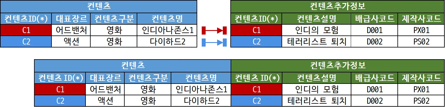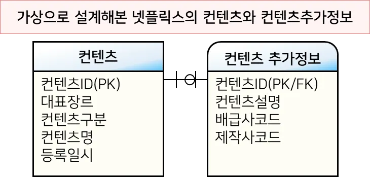 1:1 조인의 예를 살펴보자. 아래는 넷플릭스의 컨텐츠와 컨텐츠추가정보를 가상으로 설계해본 것이다. 두 테이블은 1:1 관계다.