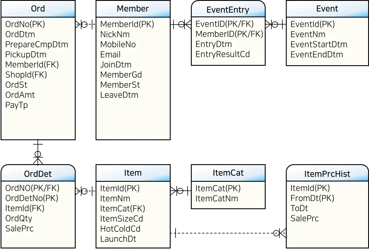 위의 ERD를 살펴보면 Shop(매장)과 Ord(주문)간에 관계선이 그려져 있다. 그러므로 두 테이블은 서로 조인을 할 수 있다. Shop 테이블의 PK인 ShopId가 Ord 테이블에서는 FK로 사용되고 있다. PK/FK 컬럼인 ShopId 컬럼을 사용해 조인을 처리하면 된다. 아래와 같이 조인 SQL을 작성할 수 있다.
