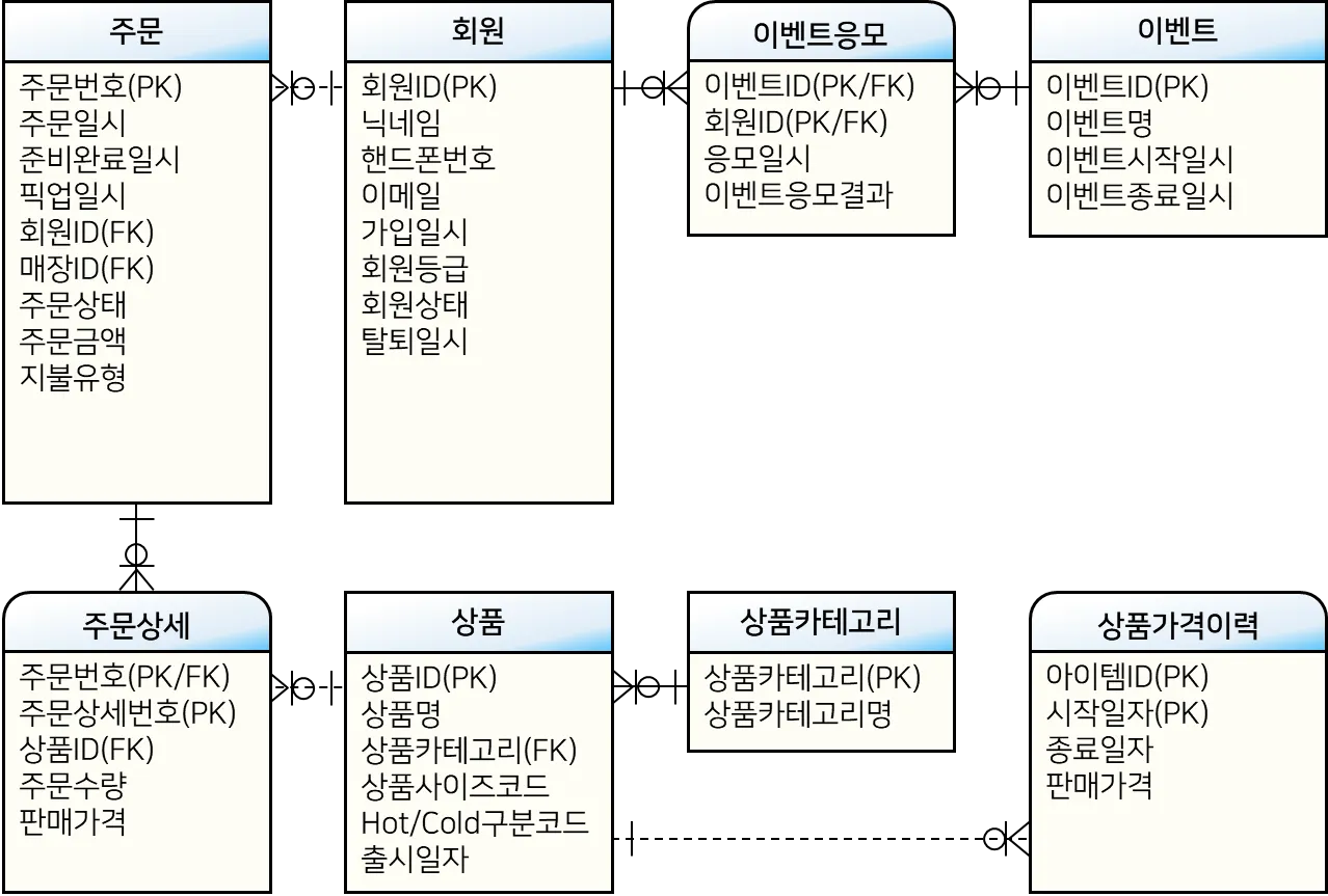 위 ERD를 참고하고, 아래 조인 SQL의 괄호 부분을 채워서 조인 SQL을 완성하고 실행해보기 바란다.