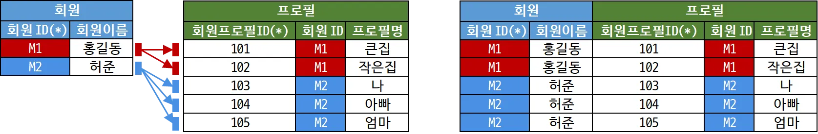 조인 결과는 1쪽의 데이터가 M쪽 건수만큼 늘어날 수 있다.