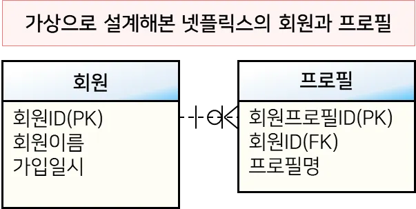 아래는 1:M 조인의 예를 위한 넷플릭스의 회원과 프로필 테이블이다. 두 테이블은 회원ID로 조인을 할 수 있다. 넷플릭스를 사용해봤다면 한 명의 회원이 여러 개 프로필을 사용할 수 있다는 점을 알 것이다.