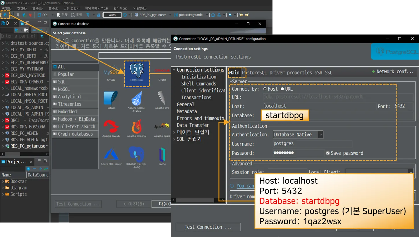 디비버에 startdbpg로 접속하는 컨넥션을 축가합니다.