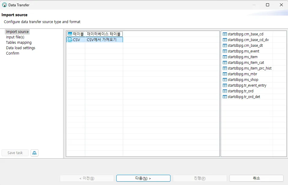 Tables mapping: Source와 Target이 제대로 매핑되었는지 확인 후 문제 없으면 다음을 클릭합니다. 매핑이 맞지 않으면, 처음부터 다시 작업하는 것을 권장합니다.