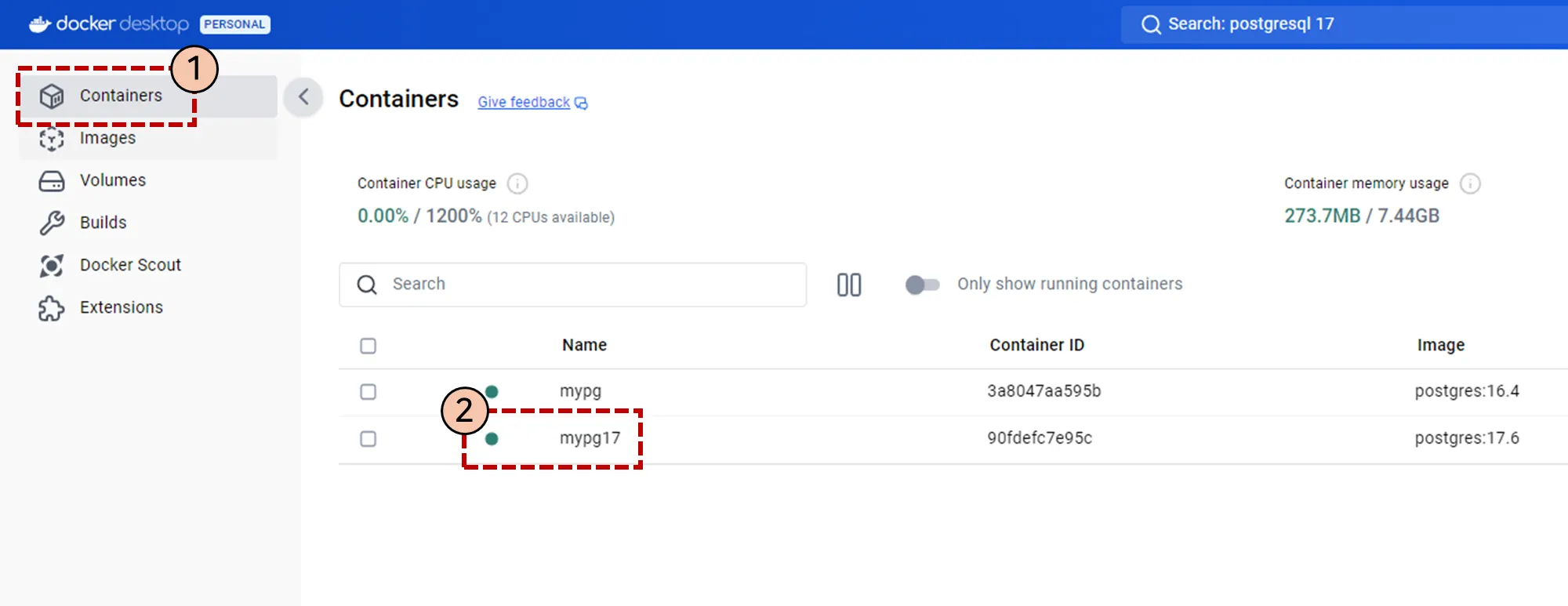 Docker Desktop에서 컨테이너에 진입해 Exec 메뉴를 클릭합니다.