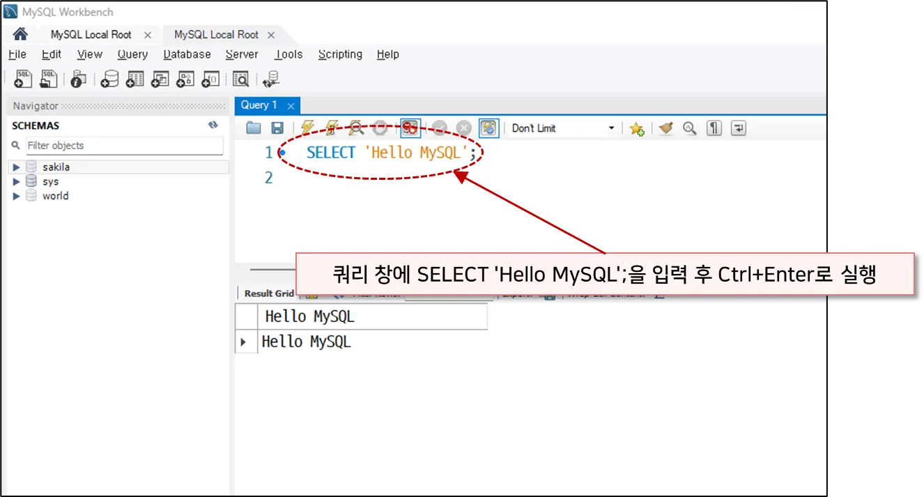 Workbench의 SQL 창에 아래의 SQL을 입력하고 SQL을 실행해보자. SQL을 입력 후 Ctrl+Enter를 입력하면 SQL이 실행된다.