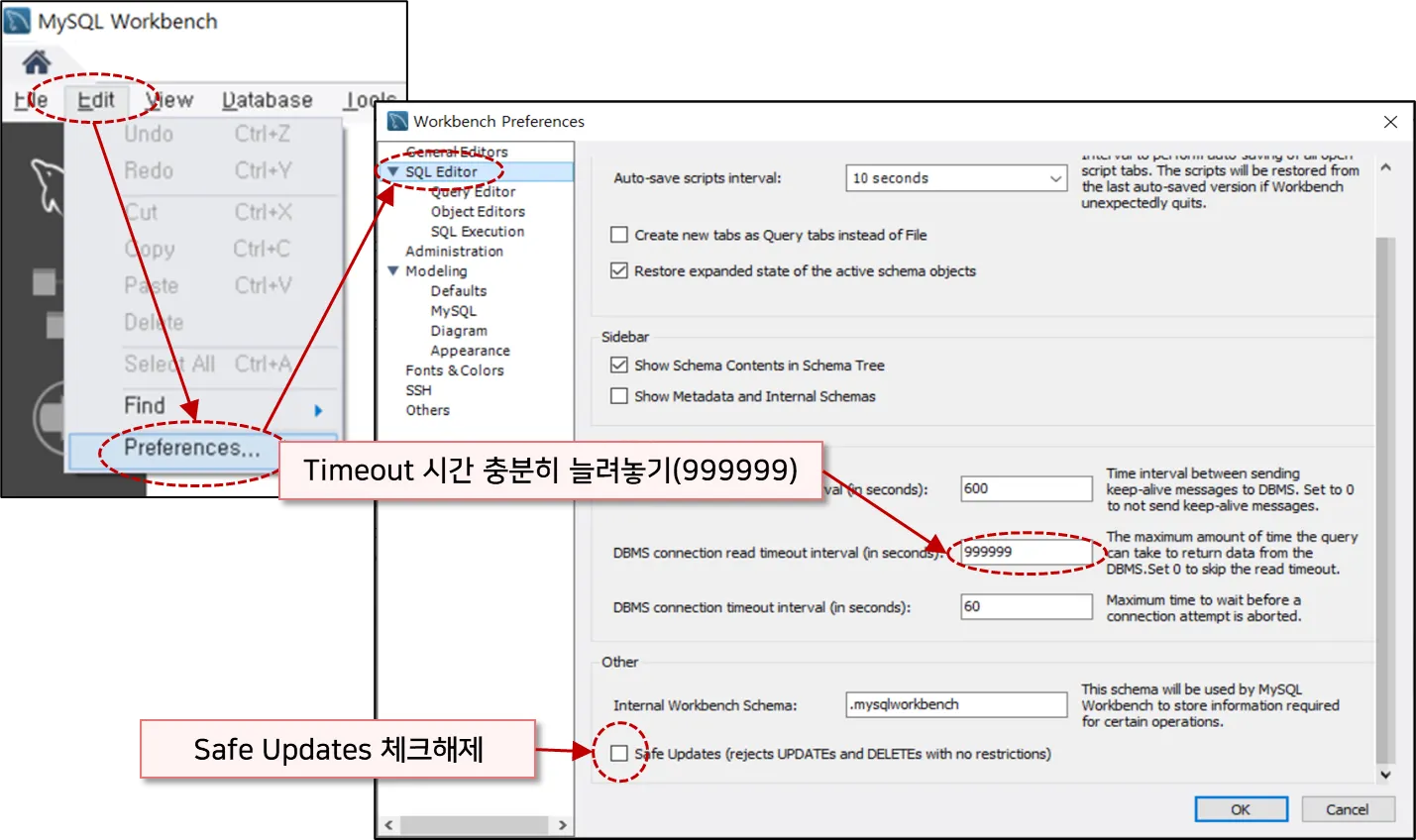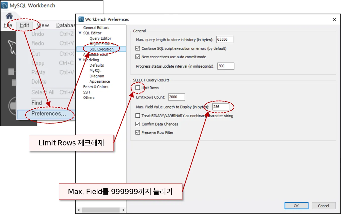 SQL 실습 진행을 위해 Workbench의 설정 몇 가지를 변경해보자.