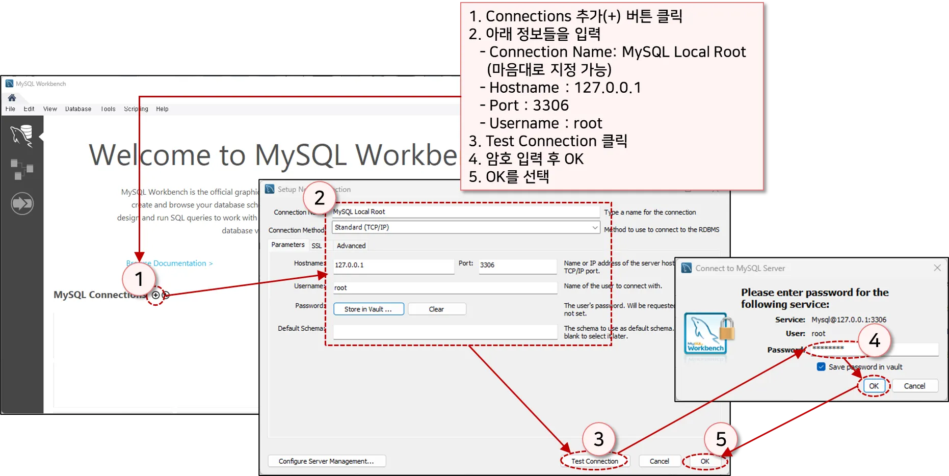 Workbench를 실행해 Connection 추가 버튼을 클릭해 아래 그림과 같이 새로운 컨넥션을 추가하도록 하자. 여기서는 연습의 편의를 위해 root 계정을 그대로 사용한다.