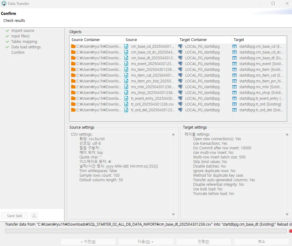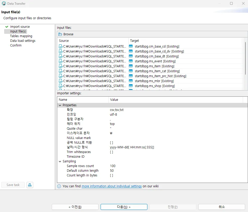 Input file(s): 왼쪽의 Source 항목을 하나씩 클릭해 오른쪽 Target과 같은 명칭의 CSV 파일을 하나씩 선택합니다. 모두 선택(총 12개)후 다음을 클릭합니다. 서로 다른 Source와 Target을 선택하지 않도록 주의합니다.