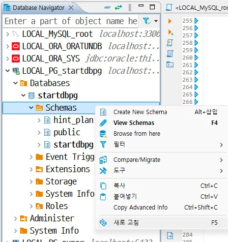 DBeaver의 왼쪽 Database Navigator 창에서, 앞에서 만든 PG(PostgreSQL)의 startdbpg 컨넥션을 클릭해 Schemas의 목록을 새로고침합니다.