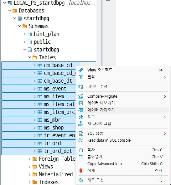 새로 생성된 테이블들을 모두 선택 후 마우스 우클릭해 데이터 가져오기를 선택합니다.
