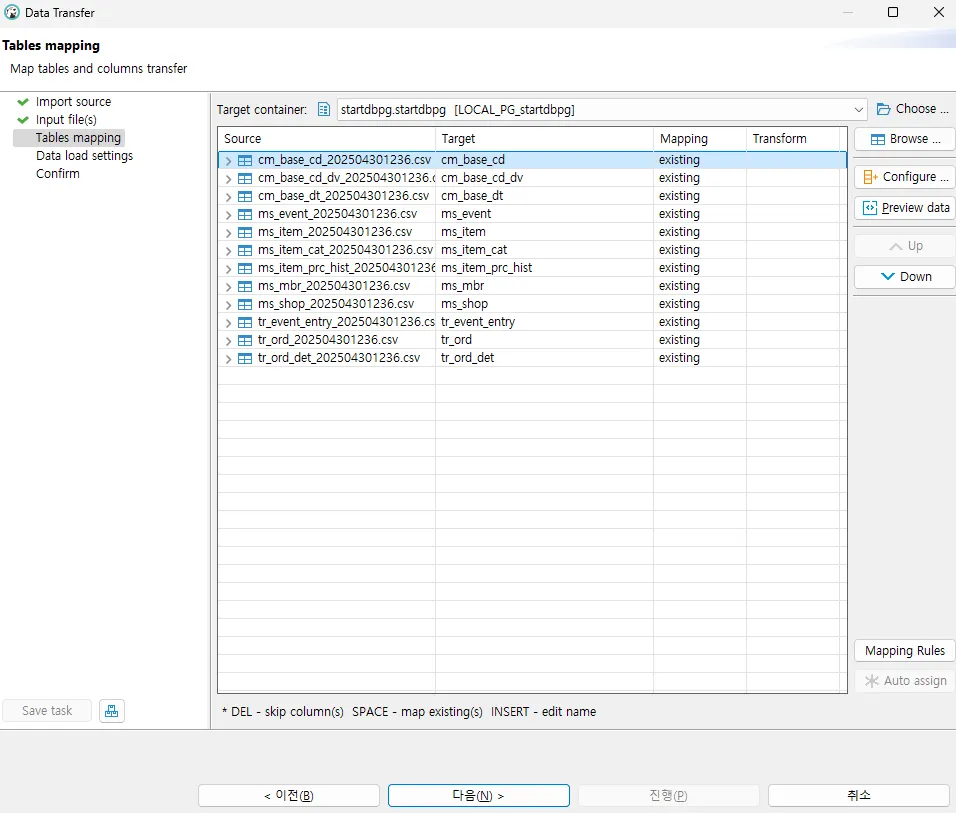Tables mapping: Source와 Target이 제대로 매핑되었는지 확인 후 문제 없으면 다음을 클릭합니다. 매핑이 맞지 않으면, 처음부터 다시 작업하는 것을 권장합니다.