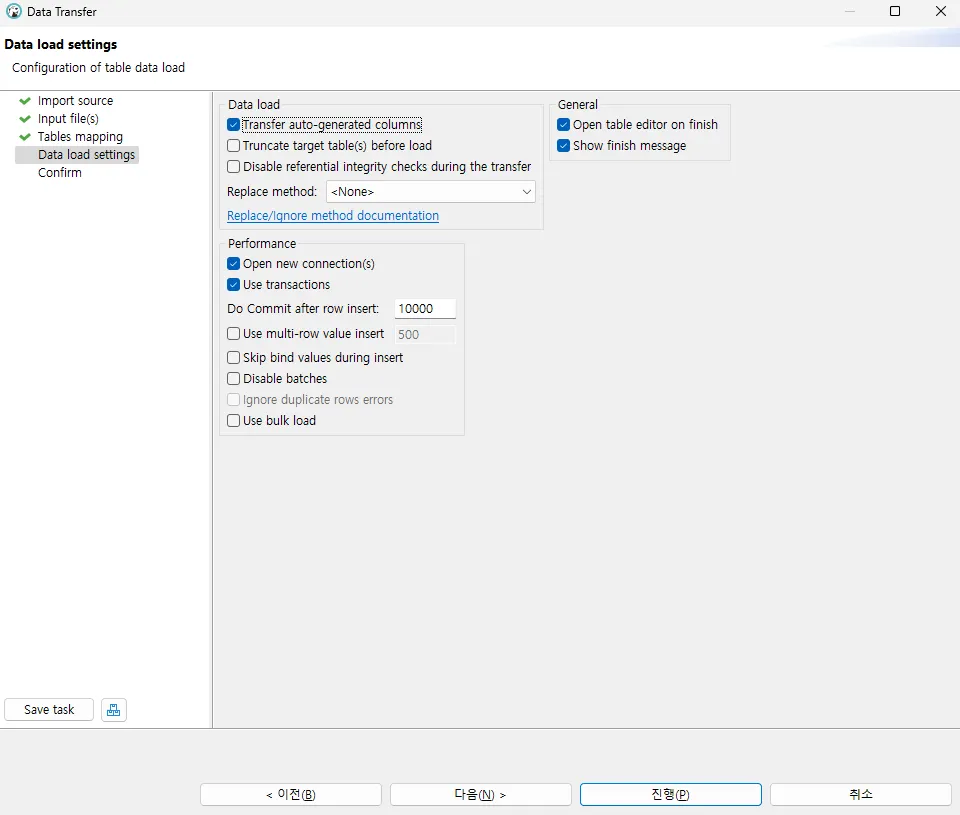 Data load settings: 진행을 클릭합니다.