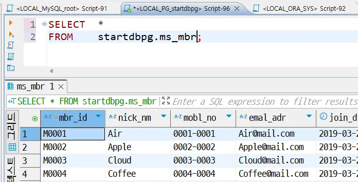 새롭게 SQL 창을 열어서 아래와 같이 ms_mbr에 데이터가 성공적으로 입력되었는지 조회해봅니다.
