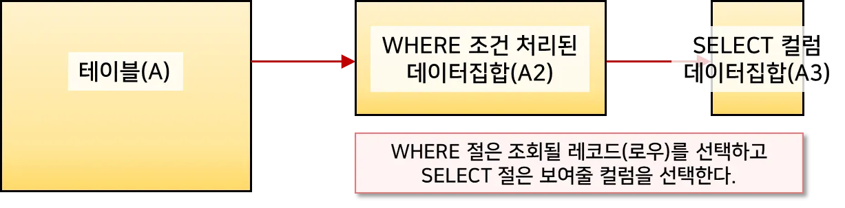 WHERE 절은 데이터 집합의 높이를 변화시키고, SELECT 절은 데이터 집합의 넓이를 변화시킨다. SQL을 작성할때 이와 같이 데이터 집합이 변한다는 걸 기억하기 바란다.