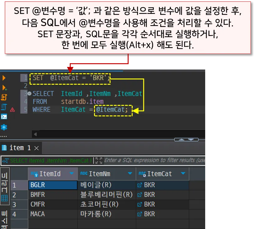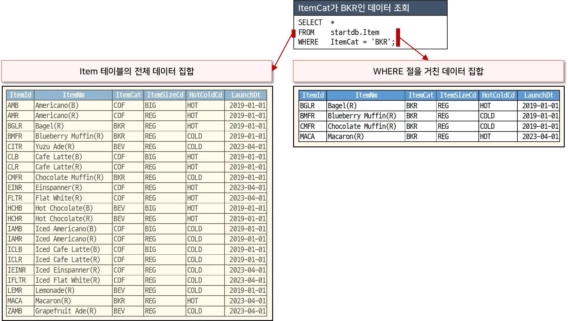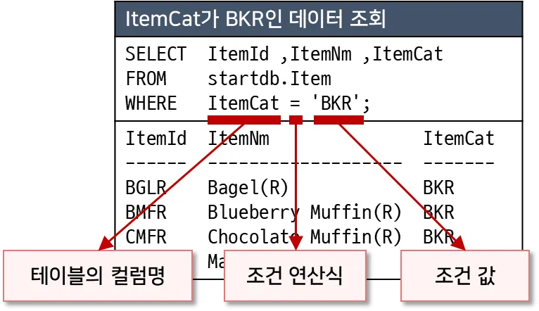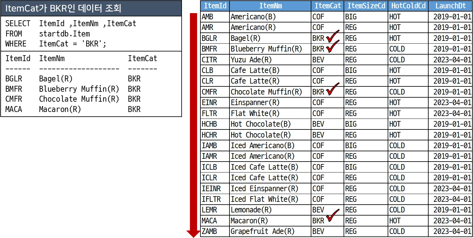 왼쪽의 SQL을 먼저 보면 Item 테이블에서 ItemCat(상품종류)가 'BKR'(베이커리)인 데이터만 조회하고 있다. 이 경우, 오른쪽 그림과 같이 Item 테이블의 데이터를 한 건씩 확인해 ItemCat가 'BKR'인 레코드(로우)만 찾아서 결과로 내보내 준다. 위 SQL은 SELECT 절에서 ItemId, ItemNm, ItemCat만 사용했기 때문에, 세 개의 컬럼만 결과로 출력된다. 만약에 SELECT 절에 *를 사용했다면 조건에 해당하는 레코드의 모든 컬럼을 보여줄 것이다.
