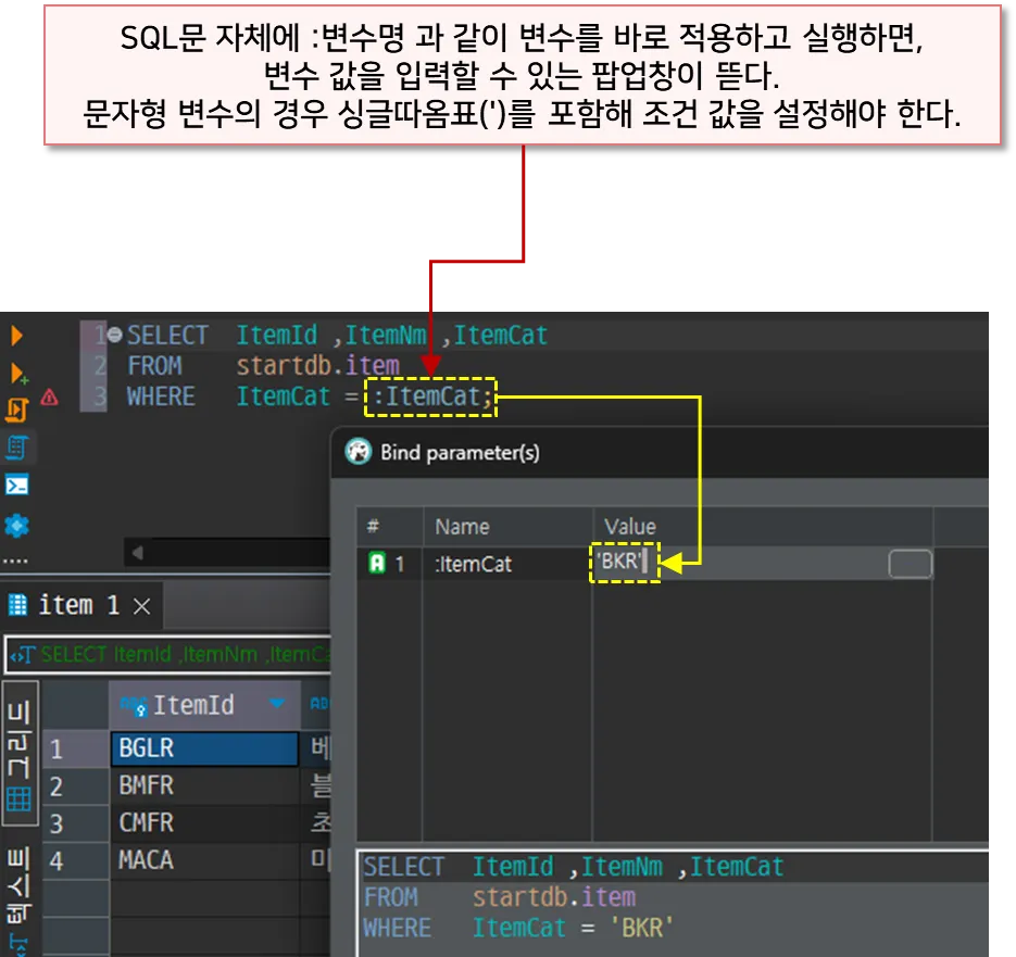 바인드 변수를 사용해 조건을 처리할 수 있다. DBMS와 SQL 툴에 따라 사용법이 다를 수 있다.