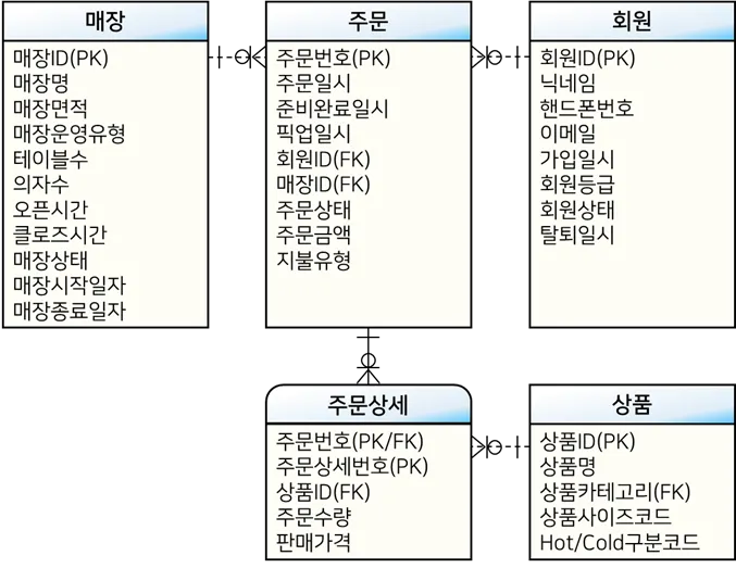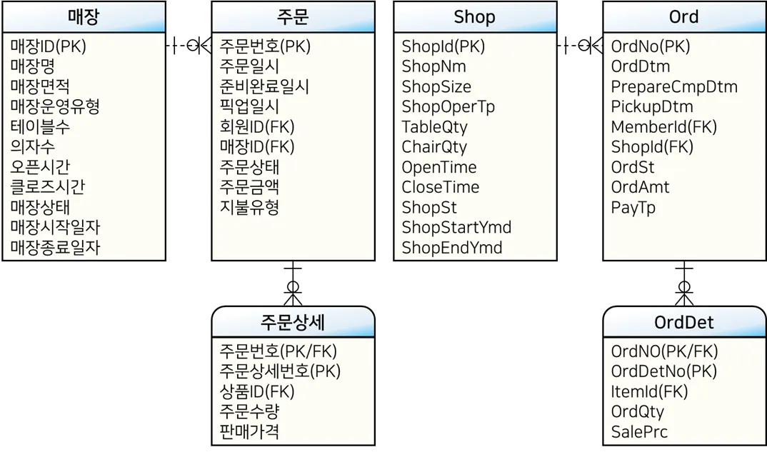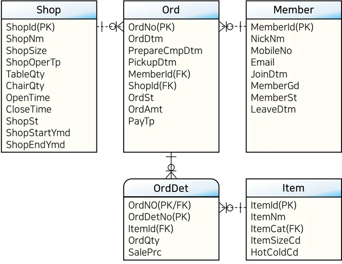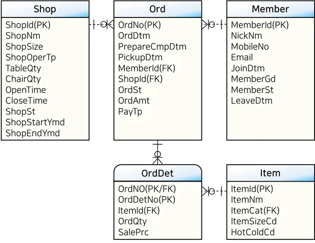 대상 테이블: 매장(Shop), 회원(Member), 주문(Ord), 주문상세(OrdDet), 상품(Item)