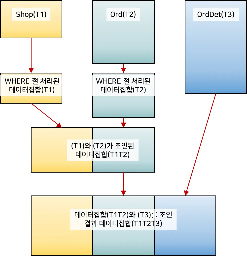 위 SQL로 우리는 (Shop+Ord) 데이터 집합을 만들어냈다다. 이제 (Shop+Ord) 데이터 집합과 OrdDet를 조인해야 한다. 두 데이터 집합 간에 조인 조건 컬럼은 OrdNo(주문번호)다.