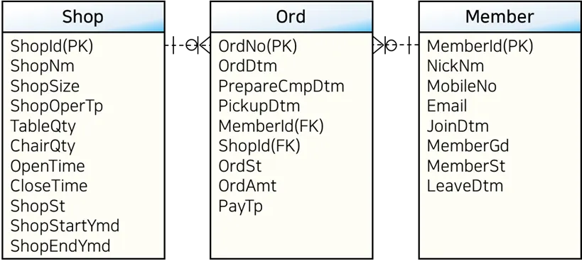 매장(Shop), 주문(Ord), 회원(Member)의 ERD를 살펴보면 다음과 같다.