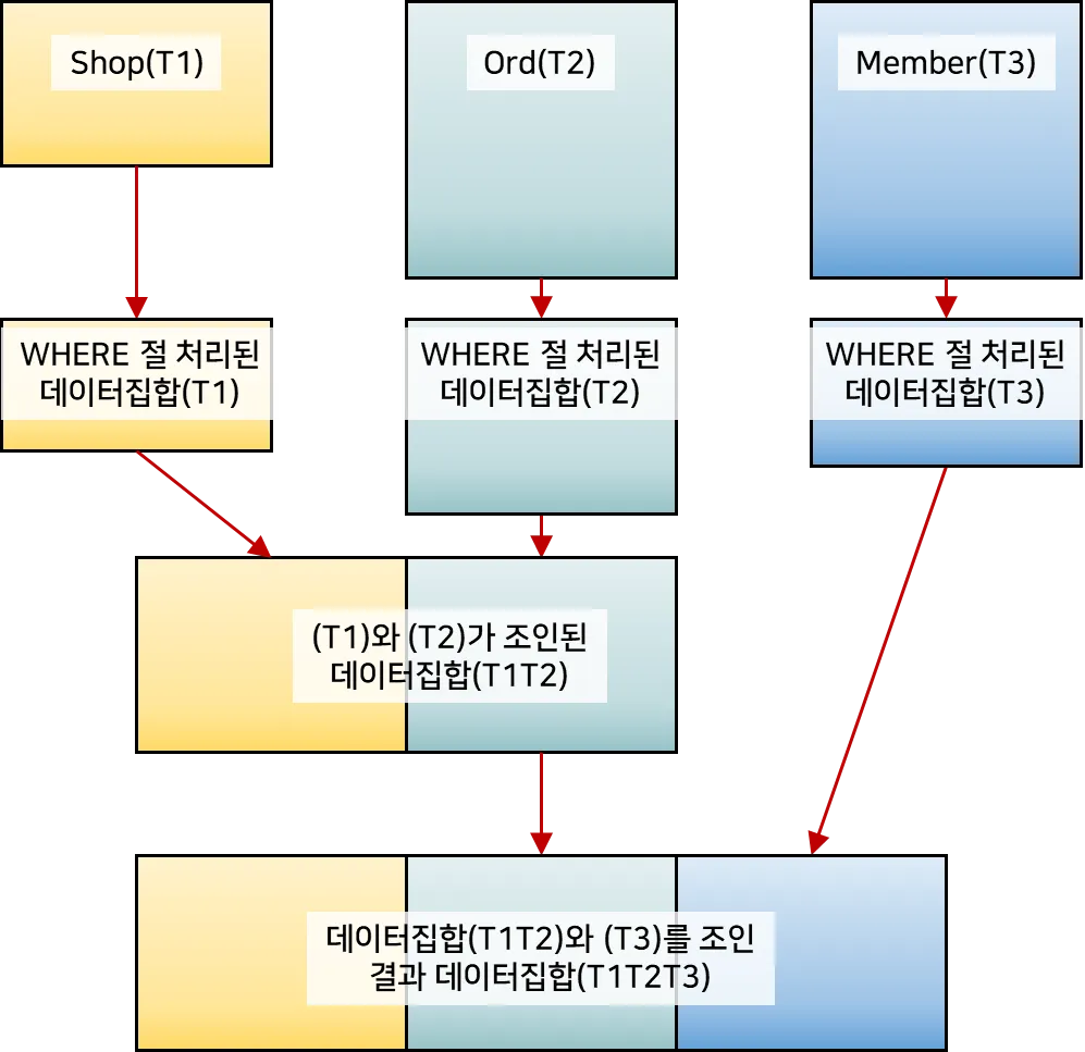 위 SQL을 통해 (Shop+Ord)라는 새로운 데이터 집합이 만들어진 것이다. 이제 이 데이터 집합에 Member를 추가로 조인하면 된다. Ord에 조인을 추가하는 것이 아니라 (Shop+Ord) 데이터 집합에 조인을 추가하는 것이다. (Shop+Ord) 데이터 집합에는 MemberId가 있으며, MemberId는 Member 테이블의 PK다. 그러므로 MemberId 컬럼을 이용해 두 데이터 집합을 조인처리하면 된다. 다음과 같다.