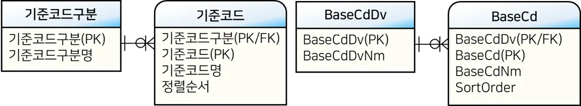 우리가 실습 중인 데이터베이스에는 BaseCdDv(기준코드구분)와 BaseCd(기준코드) 테이블에 코드성 데이터의 정보가 담겨있다. BaseCdDv는 기준코드의 종류를 정의하기 위한 부모 테이블이다. 실제 기준코드에 대한 정보는 BaseCd 테이블만 확인하면 알 수 있다. BaseCdDv와 BaseCd 테이블은 아래와 같은 구조다.