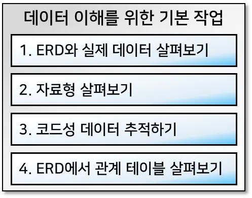ERD로 테이블의 각 컬럼이 의미하는 바를 확인하고, 데이터를 조회해 각 컬럼별로 어떤 값들이 있는지 살펴보자. 그리고 컬럼별로 자신의 생각을 정리해보자. 이것 만으로 데이터와 한층 더 가까워질 수 있다. 살펴본 내용을 아래와 같이 정리해보자.