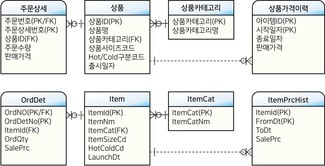 ERD를 살펴보면, Item 테이블과 관계선으로 연결된 테이블을 발견할 수 있다. 아래와 같이 Item(상품) 테이블과, ItemCat(상품카테고리), ItemPrcHist(상품가격이력), OrdDet(주문상세) 테이블이 연결되어 있다. 이를 통해 Item 테이블이 아래 테이블들과 관련이 있구나 정도만 기억해도 성공이다.