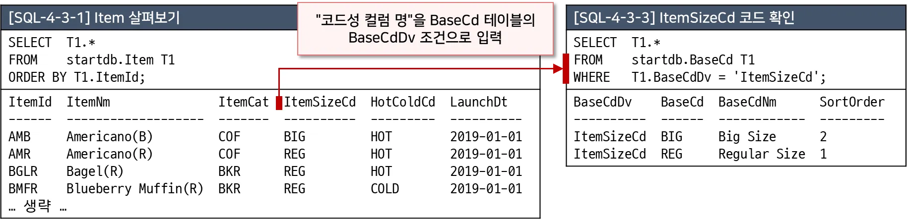 우리가 실습 중인 STARTDB의 테이블들에는 기준코드를 사용하는 규칙이 있다. 기준코드로 관리하는 값을 갖는 컬럼은, 컬럼명 자체를 기준코드구분(BaseCdDv) 값으로 사용하게 되어 있다. 그러므로 Item(상품) 테이블에 ItemSizeCd(상품사이즈코드)란 컬럼의 코드 값들을 확인하고 싶다면, 아래와 같이 BaseCd 테이블에 BaseCdDv 조건으로 ItemSizeCd를 사용하면 된다. 아래 SQL의 결과를 통해 ItemSizeCd의 코드에 따른 명칭을 알 수 있다. 이어서 HotColdCd에 대한 코드 명칭도 확인해보자.