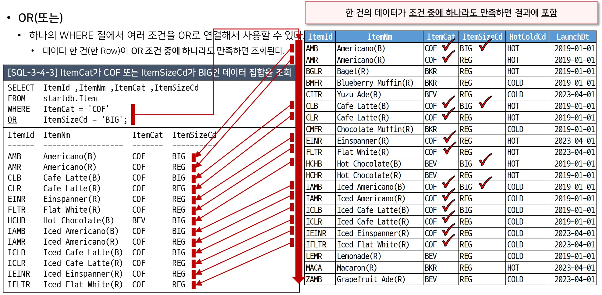 아래 SQL을 살펴보자. ItemCat(상품종류)가 COF(커피)이거나 ItemSizeCd는 BIG인 상품을 조회하고 있다. 두 조건 중에 하나라도 만족하면 결과에 포함되는 것을 알 수 있다.