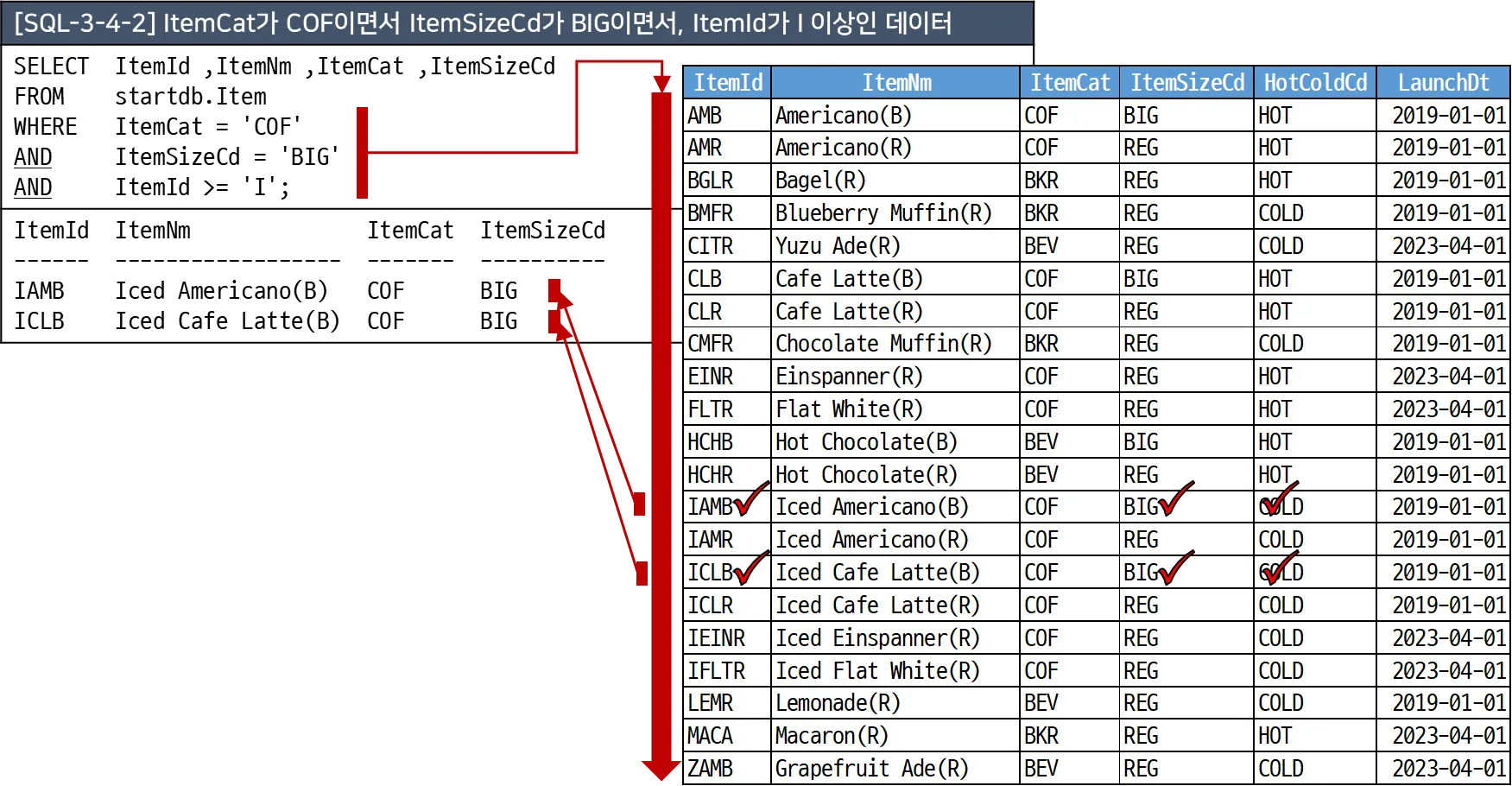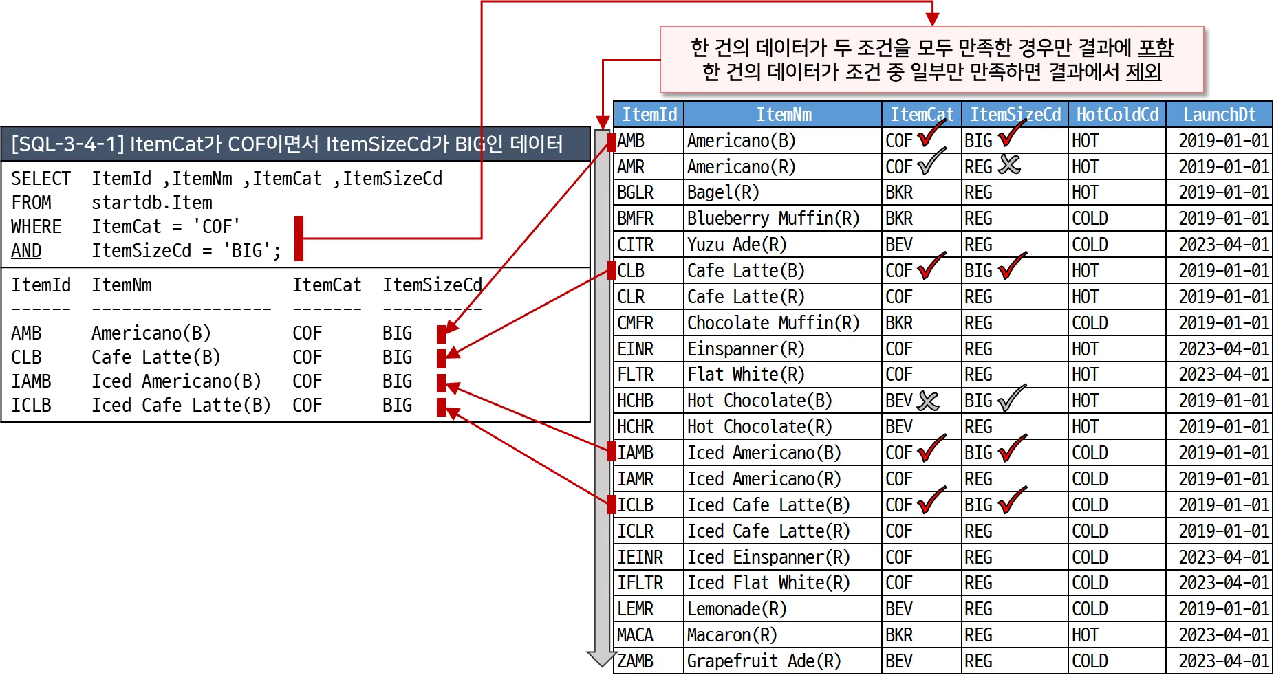 아래 SQL은 Item(상품) 테이블에서 ItemCat(상품카테고리)가 COF(커피)이면서, ItemSizeCd(상품사이즈코드)가 BIG인 상품을 조회하고 있습니다. AND를 사용해 ItemCat에 대한 조건과 ItemSizeCd에 대한 두 조건을 연결하고 있다.