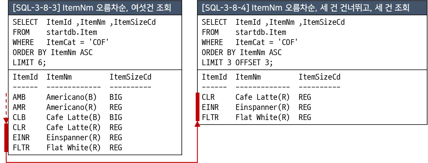 ORDER BY를 제외하고 LIMIT만 사용할 수도 있다. 몇 건의 샘플 데이터를 빠르게 확인하고 싶다면 이처럼 하는 것이 좀 더 도움이 될 수 있다. (ORDER BY가 포함되면 상황에 따라 DBMS 내부적인 데이터 정렬이 발생한 후에 LIMIT 가 처리된다.)