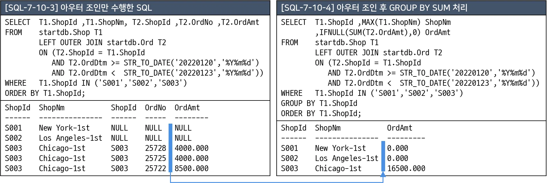-- [SQL-7-10-4] 아우터 조인 후 GROUP BY SUM 처리