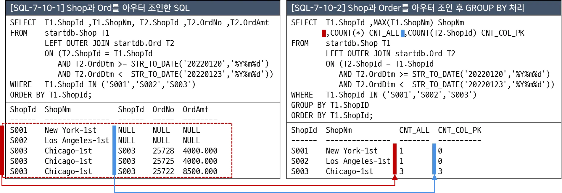 아우터 조인에서 COUNT(*)와 COUNT(참조집합컬럼)에 따라 집계 결과가 다름에 주의가 필요하다.