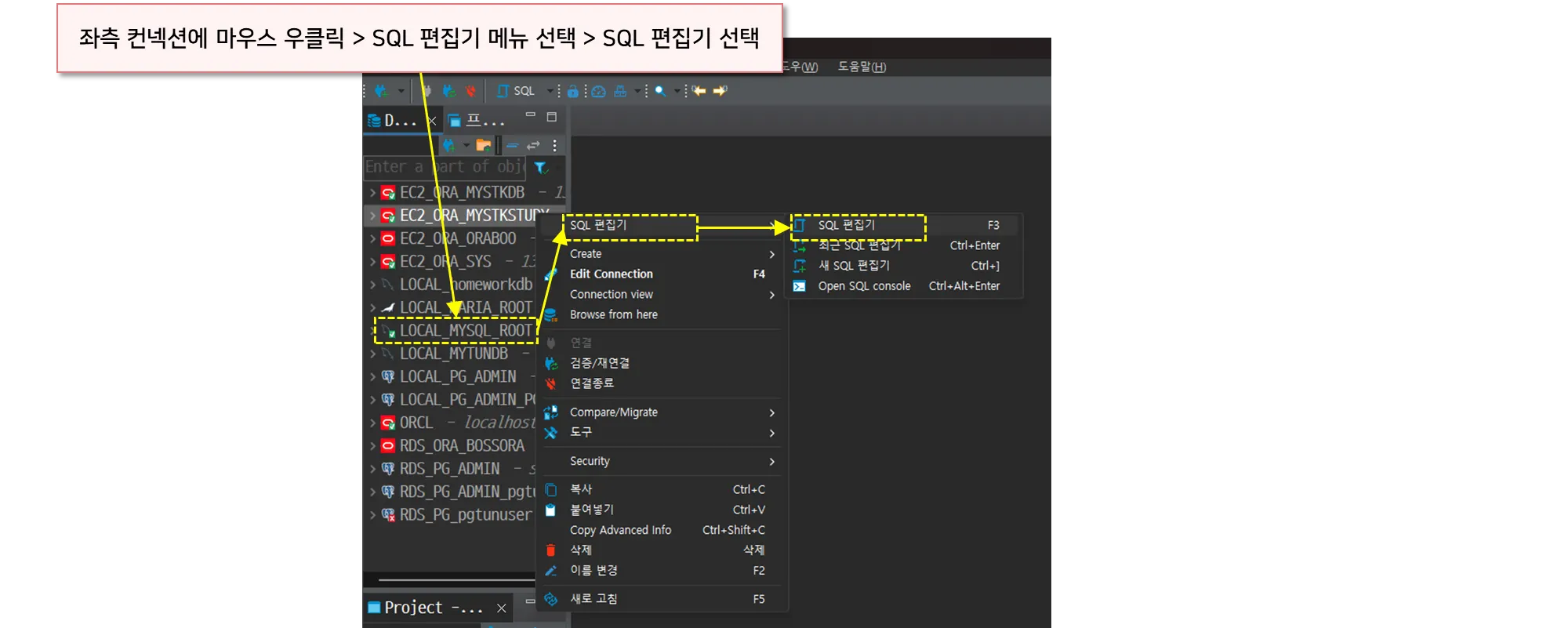 Connection을 성공적으로 생성했다면, 아래와 같이 새로 만든 컨넥션에 마우스 우클릭 후 SQL 편집기를 선택해 SQL 창을 열 수 있다.