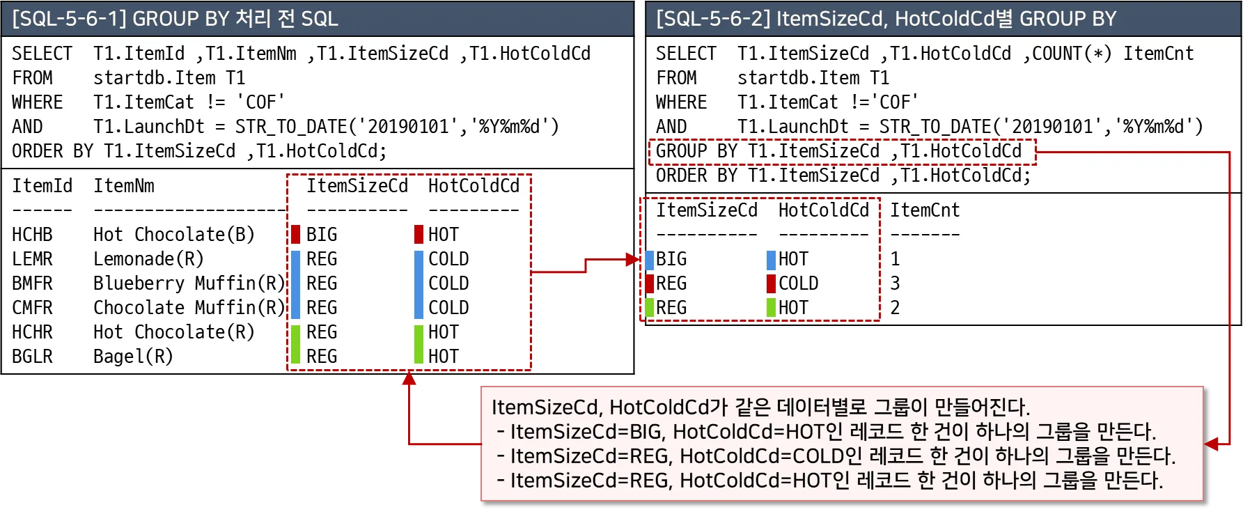 -- [SQL-5-6-2] ItemSizeCd, HotColdCd별 GROUP BY