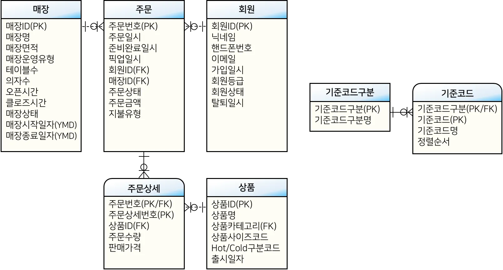 지금까지 사용한 테이블들의 코드성 컬럼에 대한 정보가 저장되어 있다. 이 기준코드 테이블을 사용해 코드에 대한 값을 가져올 수 있다. 코드 데이터를 구성할 때 코드 값을 001, 002와 같이 무의미하게 구성할 수도 있으며, 위 결과와 같이 COMP(완료), WAIT(대기)와 같이 유의미하게 구성할 수도 있다. 유의미는 코드 자체만으로 의미를 알 수 있는 장점이 있지만, 비즈니스 로직의 추가나 변경으로 코드의 의미가 바뀔 때 큰 곤란을 겪게 된다. 규모가 크고 확장성을 고려한 시스템일수록 유의미보다 무의미 코드 체계가 조금 더 좋은 선택일 수 있다. 우리가 사용중인 startdb는 연습을 목적으로 하기에 유의미 코드 체계를 사용하고 있다. 코드 체계의 유의미, 무의미보다 중요한것은 코드 데이터를 DB화해서 프로세스를 만들어 관리하고 있느냐이다. 코드를 제대로 관리하지 않으면 나중에 데이터를 제대로 해석할 수 없게 되며, 이는 데이터 활용에 큰 어려움을 가져오게 된다.