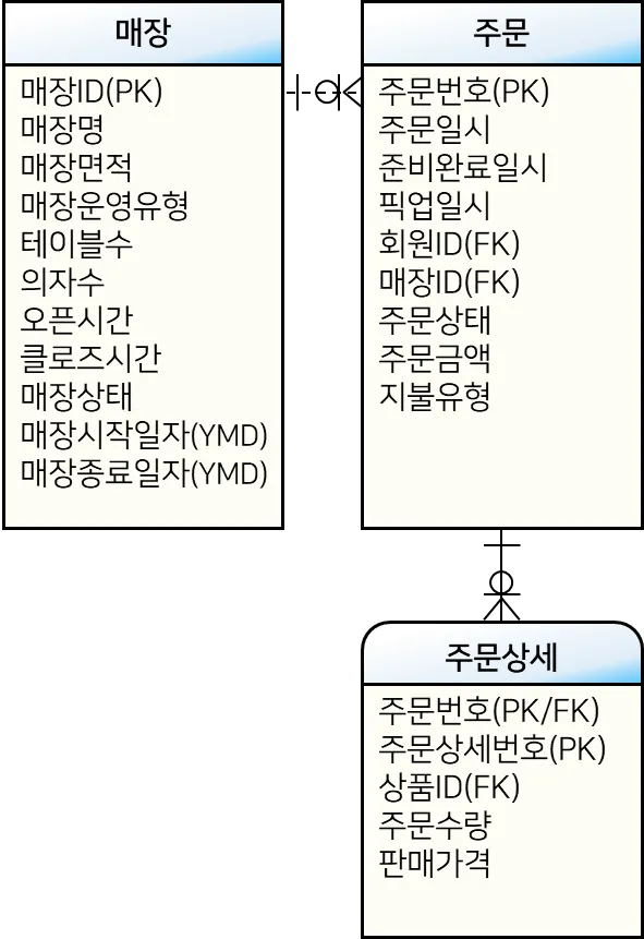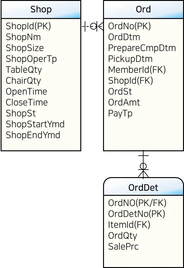 아래 ERD를 살펴보자. Shop과 Ord는 1:M 관계다. 그리고 Ord와 OrdDet도 1:M이다. 이 세 테이블의 관계를 간략하게 (1:M):M 이라고 말할 수 있다. 정확히는 앞쪽의 1:M 조인 결과가 나머지 M과 조인시에 1 집합이 된다. 복잡하니 간단하게 (1:M):M 조인라고 하도록 하자.