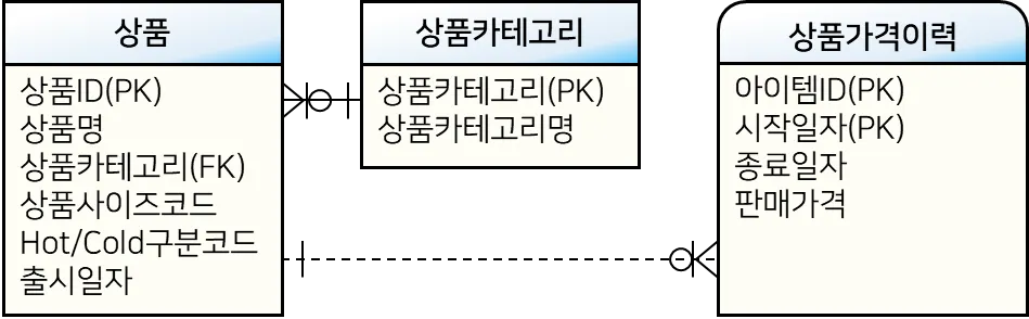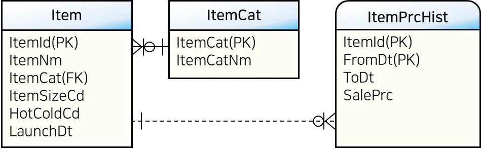 상품(Item) 테이블은 지금까지 계속 사용해왔기 때문에 익숙할 것이다. 상품의 가격 변화를 관리하는 상품가격이력(ItemPrcHist)의 데이터를 살펴보자.