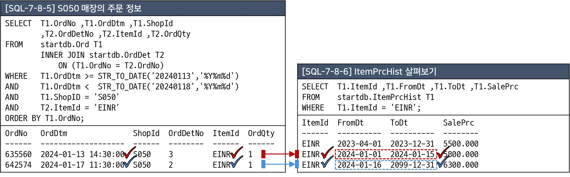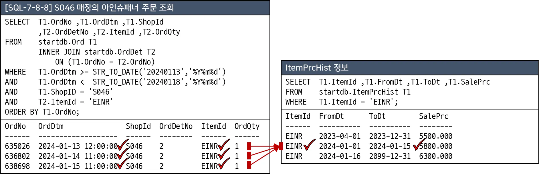 2024년 1월 13일 주문에는 위 결과에서 두 번째 레코드인 5,800원이 조인되어야 하고, 2024년 1월 17일 주문에는 세번째 레코드인 6,300원이 결합되어야 한다. 이처럼 조인을 하기 위해서는 ItemPrcHist의 FromDt와 ToDt 사이에 Ord의 OrdDtm이 들어가도록 조인 조건을 처리해야 한다.