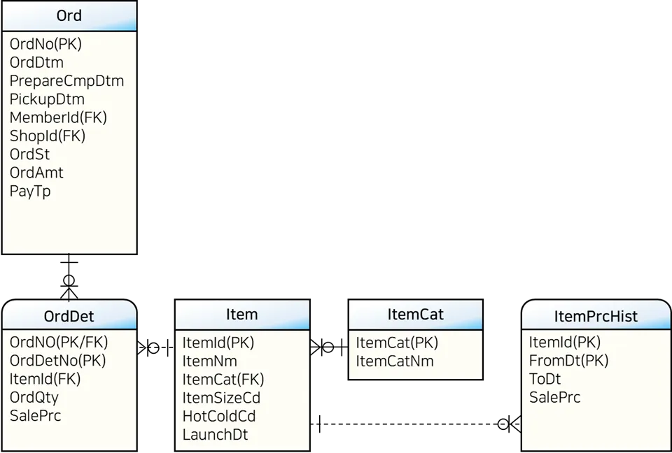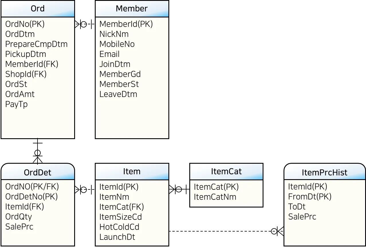 대상 테이블: 회원(Member), 주문(Ord), 주문상세(OrdDet), 상품(Item), 상품가격이력(ItemPrcHist)